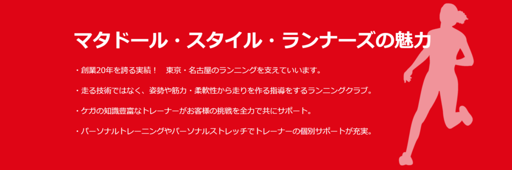 マタドール・スタイル・ランナーズは、東京・名古屋で珍しくパーソナルトレーニングジムが運営、パーソナルトレーナーが指導するランニングクラブです。